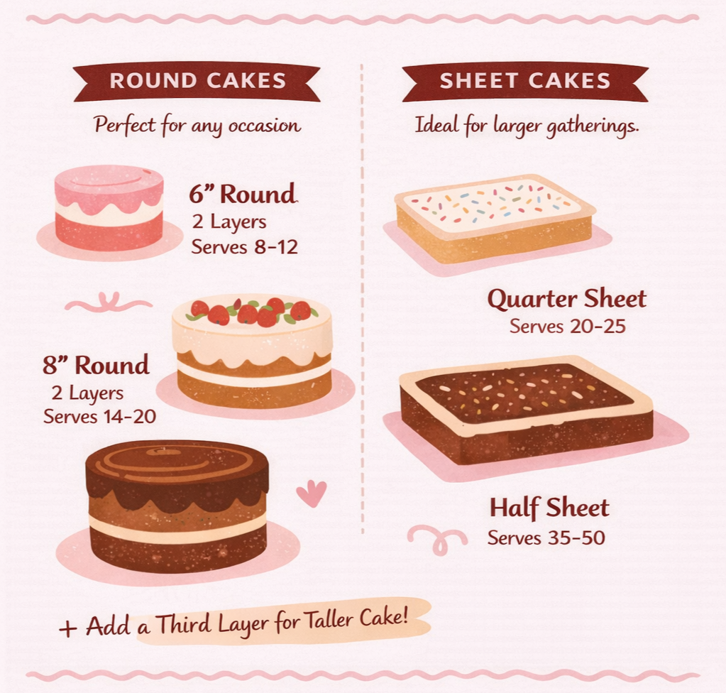 For round cakes, we offer 6'“, 8”, and 9” cakes. For rectangular cakes, we offer 9×13, half sheet, and table runner cakes. If you’re looking for a different size, let us know and we’ll see if it’s possible. All cakes are available in 2- or 3-layers.